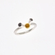 Ring aus 925 ‰ Silber mit drei unterschiedlich großen konisch zulaufenden Fassungen, so daß diese aussehen wie Tüten. Als Steine wurden Granat, Peridot und Citrin verwendet. Der Ring hat eine Ringgröße von 60, die Ringschiene ist aus Runddraht und dieser hat einen Durchmesser von ca. 2.5 mm. Die Fassungen inkl. Ringschiene und Steine sind ca. 9 – 10 mm lang